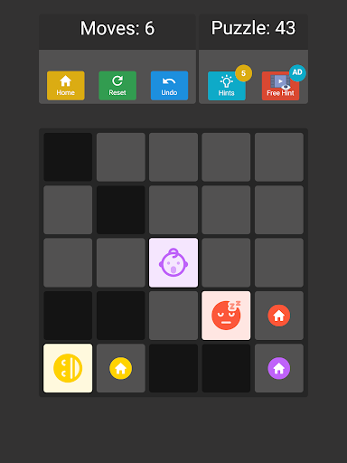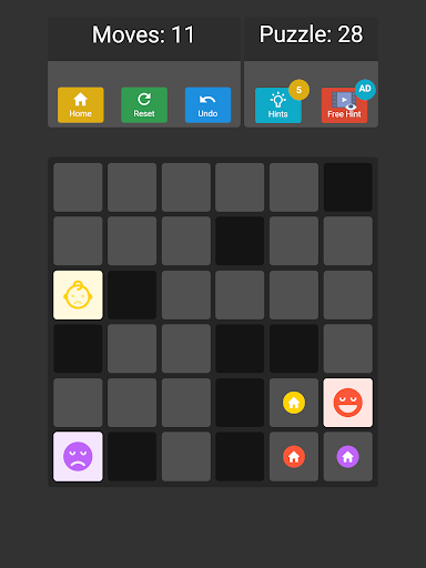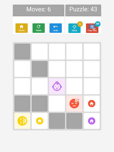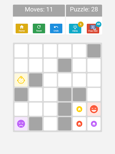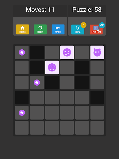 Ana amaç tüm emojileri koymaktır. Belirli bir hamle içindeki evler. EMOJIS'u hareket ettirmek için ekranda kaydırın (sola, sağ, yukarı, aşağı). Tahtadaki bloklar veya engeller, emojilerin kaydırılmış yönde ilerlemesini engelleyecektir. Her emoji hareketi senkronize edilir ve sola doğru kaydırırsanız ve tahtada üç emoji vardır, her emoji son hareketli hücreye sola hareket eder. Uzman modunda, her emojiyi eşleşen renkli evine koymanız gerekir.