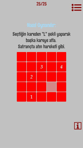 Kareden kareye atlayarak hepsini yok et. Tek bir kural var! Sadece "L" şekli oluşturan karelere atlayabilirsin. Satrançtaki atın hareketi gibi. Birbirinden farklı 28 kademeyi yenmeye çalış veya sonsuz kademede arkadaşlarınla yarış.