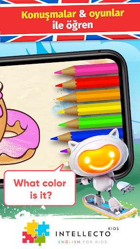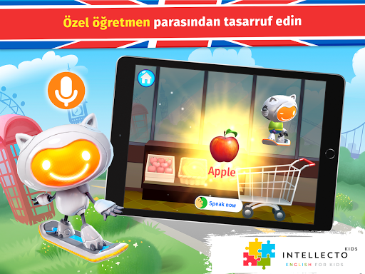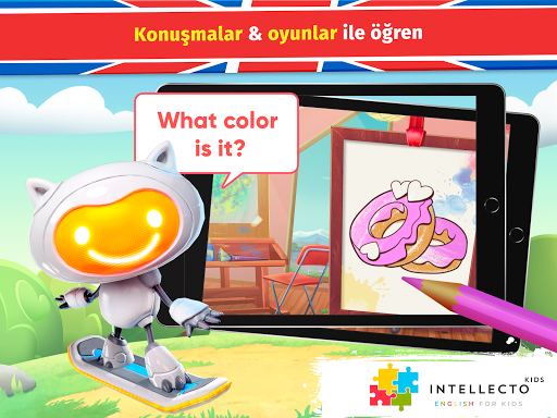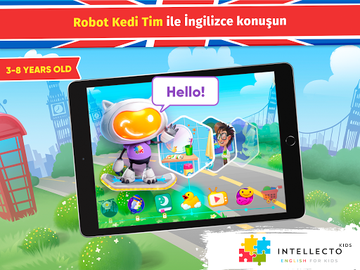 Çocuklar İçin IntellectoKids İngilizce, 3-8 yaş arası çocukların eğlenceli ve etkileşimli şekilde İNGİLİZCE ÖĞRENMESİNE yardımcı olur! Sevimli bir yapay zeka karakteri olan Robot Kedi Tim, gerçek bir öğretmen gibi gündelik genel konuşmalar ve eğitici mini oyunlar üzerinden çocuğunuza İngilizce konuşmayı öğretecektir.