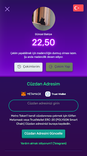 24 saatte en az 1 kere giriş yapıp "Başlat" düğmesine basmanız ve sadece 30 saniye beklemeniz yeterlidir. Sunucu tarafında Metro Token sizin için kazandırmaya devam edecektir. Daha sonra isterseniz uygulamayı kapatıp Metro Token kazanmaya devam edebilirsiniz.