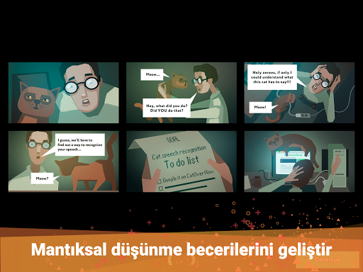 Bu oyunda, kedisinin insan dilini konuşamasa da kodlama konusunda çok iyi olduğunu kazara keşfeden bir kod yazarını oynayacaksın. Bu kod yazarının (yani senin), kedilerden insanlara bir konuşma tanıma sistemi kurabilmek için makine öğrenimi hakkında her şeyi öğrenip görsel programlamayı kullanması gerekiyor.