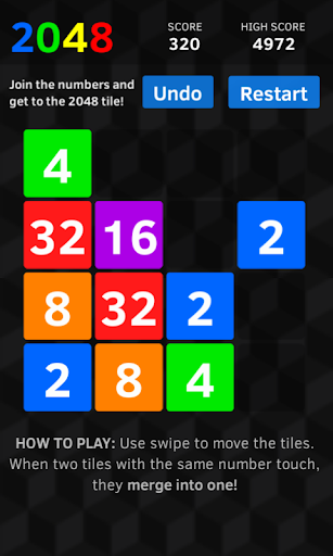 Use swipe to move the tiles. When two tiles of same number touch with swipe, they merge into one bigger tile! Reach 2048 and win the game