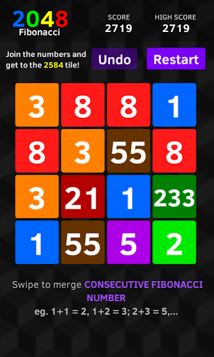 Use swipe to move the tiles. When two tiles of Consecutive fibonacci series touch each other with swipe, they merge into next fibonacci series number tile!