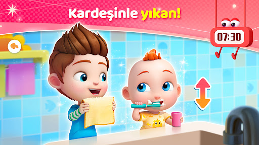Günaydın! Erkek ve kız kardeşler dişlerini fırçalamaya başladılar bile. Şimdi JoJo'ya dişlerini fırçalayıp yüzünü yıkamayı öğretme sırası sende. Hepsi tamam. JoJo'nun ailesiyle harika bir gün başladı!