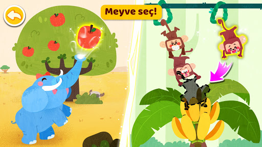 Küçük hayvanların öğle yemeği vakti. Bak, maymunlar halatlardan kayıyor, kanyonlardan geçiyor ve muz topluyor! Kedicik balık yakalamaya çalışırken suya düştü. Gelip ona yardım et. Bebek zürafa acıktı. Onu beslemek için biraz yaprak topla.