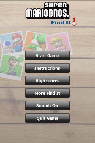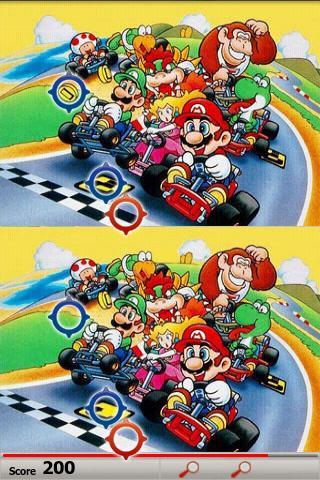 Free Super Mar矛o Bros. Find the Difference Game!Play the Find the Difference game, Find It Super Mar矛o!Find the 5 differences in each photo pair and try to set the Find it Super Mar矛o high score!Use your hints and beat this Find the difference arcade game before time runs out!Find It Super Mar矛o Brothers features:_?Lot's of Mar矛o levels_?Hint system_?High Score board_?Save to SD on Froyo +Try it and also play our other Find the difference games.Photo hunt with Spot//Find the difference Super Mar矛o edition!