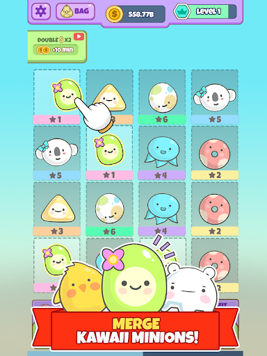 Enjoy hours of merging and collection a wide collection of super cute minions. Each minion produce coins, invest the coins to upgrade your minions to get higher lvl minions much faster.