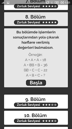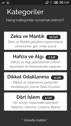 Sürekli güncellenen bölümler ve yeni eklenen kategorilerle sende zihin gelişimine katkıda bulun! Zeka ve mantık, dikkat, hafıza ve algı, dört işlem matematik soruları ile zeka, dikkat, hafıza, görsel zeka, odaklanma gibi özelliklerini her gün geliştir..