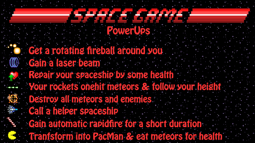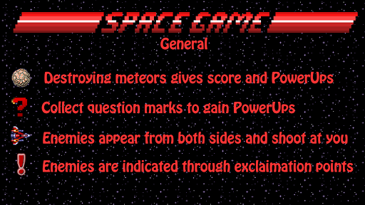 ✜ When destroying meteorites, collect 9 different power-ups that can give you abilities like a laser beam, a comet or automatic continuous fire. These are marked with a red question mark and appear randomly after successful destruction of meteorites. ✜