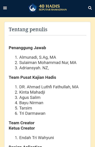 Với sự hiện diện của ứng dụng này, hy vọng sẽ cung cấp các lợi ích để toàn bộ cộng đồng rộng lớn hơn, đặc biệt là đối với các nhà hoạt động của Hadith trong việc tìm kiếm các đối số Shari'at. Cuối cùng, tôi xin cảm ơn tất cả, đặc biệt là FUSHPI và PKH, người đã ủng hộ và giúp đỡ sự hiện diện của ứng dụng "40 Hadith về Ramadhan". Allah có thể mang lại sự phong phú của sự duyên dáng và tình cảm với tất cả chúng ta.