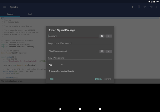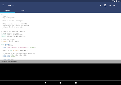 APDE (Android Processing Development Environment) is an integrated development environment for creating Processing sketches on your phone/tablet. APDE supports the full edit, compile, and run cycle. You don't need a computer or an SDK to start coding on the go.