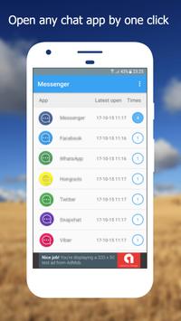 With this application, you just need one click to open your most used messenger app whenever you want to have a chat with your families and friends. It also show the number used and the recent time use for each messenger application.