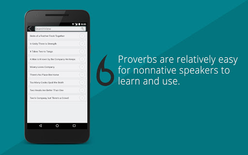 American English Proverbs is an excellent tool for teaching an aspect of English that is such an integral part of the language. This app also serves as a springboard for conversation about some of the similarities and differences between various languages and cultures. Both nonnative and native speakers of English will benefit from and enjoy the wealth of linguistic and cultural information to be found in this selection of 101 American English proverbs.