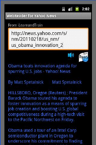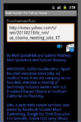 Android translator WebReaderThis Google Translate Web Translator and reader application which has been developed on the Android platform allows you to translate the news from yahoo on the web into Chinese, Spanish, French, German, Italian, Japanese and Korean. In addition to allowing you to read at your own pace, this application also provides you the feature of dictating the news automatically in either English, Spanish, German or French, so that you can just listen to the news and focus on multitasking rather than staring at your phone all the time.All you need to enter is the URL of the news article from Yahoo and click on the Read icon to have the news dictated to you automatically.Examples of some urls are as follows:http:news.yahoo.comsapusterrorbombplothttp:news.yahoo.comsapusdaycarecenterfirehttp:news.yahoo.comsafp20110225tsaltafplifestylehealthusanimalobesityhttp:news.yahoo.comsapussciarcticchildhttp:news.yahoo.comsap20110224aponreususpentagongeneralinvestigatedYou can view the video of the application on Youtube at the link that has been provided below.http:www.youtube.comwatch?vX7ulKqZBFawIf you have any questions or need additional information please feel free to email at ilearnandtrain@gmail.com.Also please take a look at the other applications that are available from us including 1. US Citizenship Test Question and Answers in multiple languages including English, Spanish, French and German.2. Elephant memory Game to test your observation skills and memory.3. Countries of the World which allows you to get upto date information on all of the countries of the world.