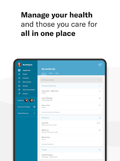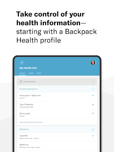 • Điều kiện, thủ tục, thuốc, dị ứng, chăm sóc bổ sung, phòng thí nghiệm, và nhiều hơn nữa - nếu nó quan trọng đối với hành trình sức khỏe của bạn, hãy giữ nó trong ba lô của bạn