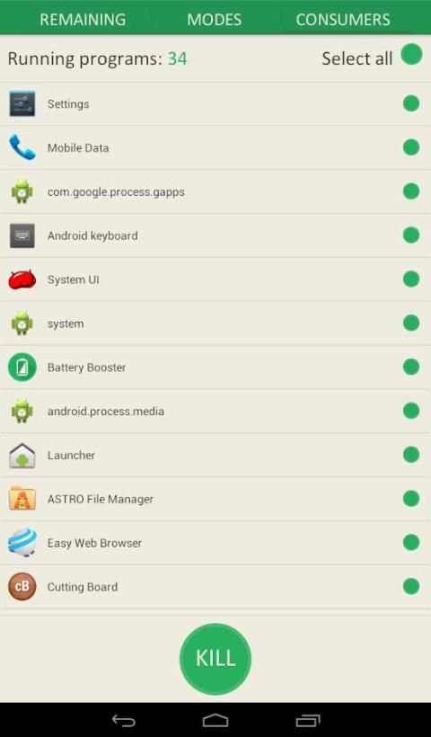 - Battery Booster allows you to kill processes which consume your battery's life.