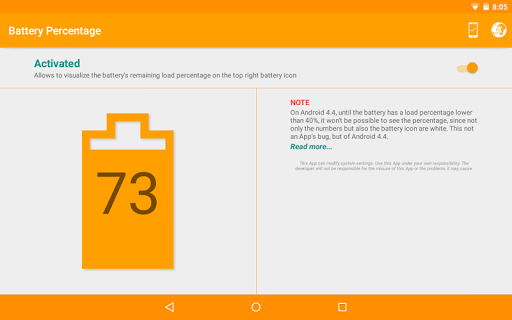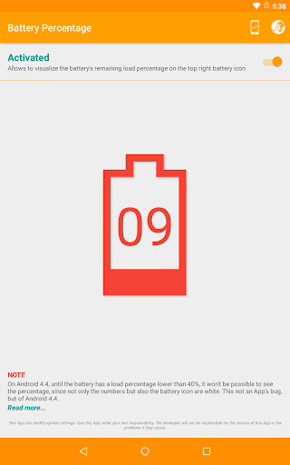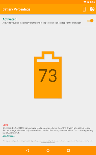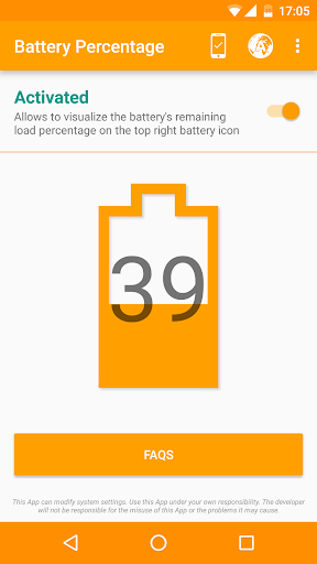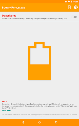 - This App does not show the battery percentage by itself, but only activates or deactivates the system setting that allows to see this battery percentage. If you uninstall the App without previously having deactivated the battery percentage, it will remain shown even after the uninstall. If you have uninstalled the App without having deactivated the option and you want to activate it afterwards, you only need to reinstall the App and deactivate the battery percentage.