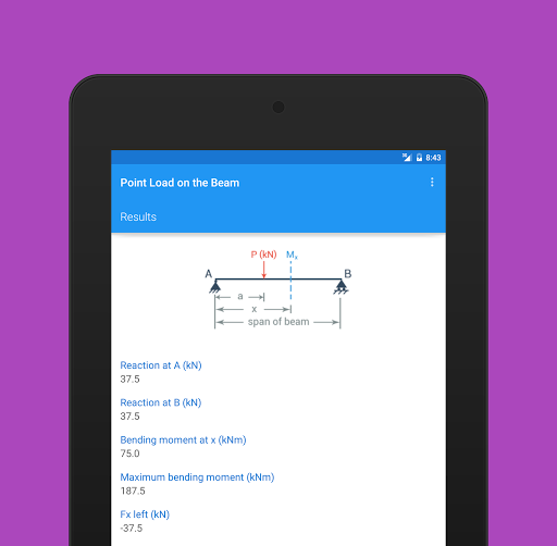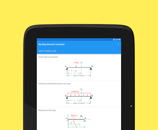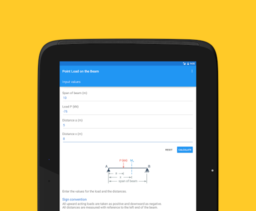 This app does not require an active internet connection for calculation of values in the case of a 'point load acting on the beam' and 'uniformly distributed load on full span', but for all other cases an internet connection is required. This constraint will be removed in future updates soon.