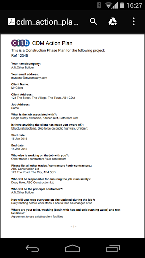 The app asks you questions about what you will be doing and the nature of the work. Most of the questions are answered with simple tick-boxes, allowing you to complete the whole process in less than 5 minutes. An action plan is then generated that can be viewed instantly on your device or can be emailed to whoever needs it. This is the Construction Phase Plan for your job and required under CDM 2015. The plan includes: