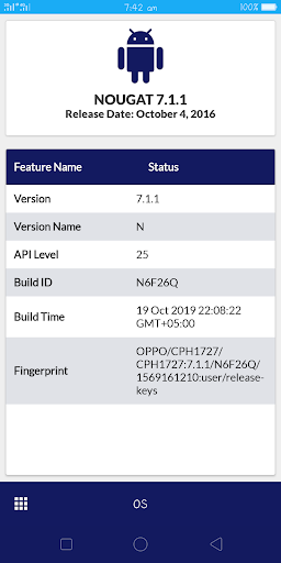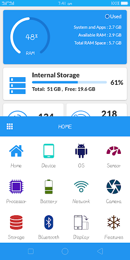 Thiết bị: Thương hiệu thiết bị & amp;Mô hình, bảng, bộ tải khởi động, độ phân giải màn hình, RAM (Tổng và RAM có sẵn), Loại mạng, Lưu trữ thiết bị.., WiFi, GPS, hình nền sống, micrô, máy gia tốc, phong vũ biểu, la bàn, con quay hồi chuyển, ánh sáng, từ trường, tăng tốc tuyến tính.Định hướng, áp lực, gần, NFC, vectơ xoay, nhiệt độ, trọng lực.