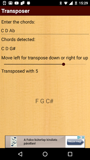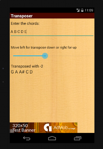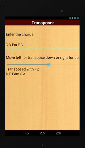 Enter the guitar chords separated with spaces and move the transposing bar left or right to transpose your chords down or up.