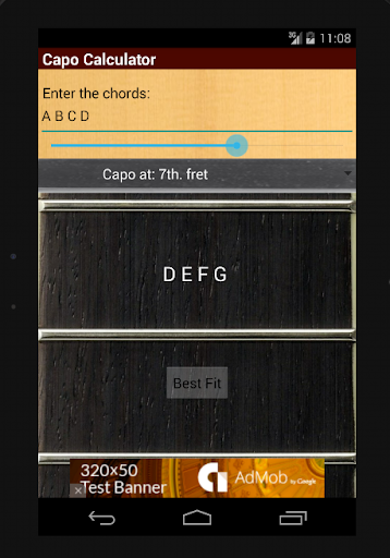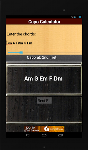 Enter the guitar chords separated with spaces and adjust the capo bar, you will able to see which chords you should play relative to capo at the chosen position. If you are beginner guitar player and you have some trouble with playing barre chords just enter the chords which are giving you a hard time and tap at the Best Fit button,