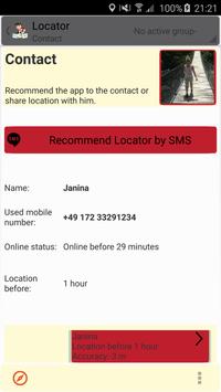 The contacts must have installed the app, too. Through the app you can send requests for location sharing to defined contacts and groups. You can choose from your mobile contacts of the android address book - the groups from there where also read in by the app and can be used there. The Sharing of location (usually GPS-based) can also be disabled easily at every time - either for every single contact or for all contacts together. The app shows also, when a contact last used the app - when he was last online - and shows also the time when a location was last sended and the accuracy of a location. The tracking is done through GPS or through another method choosen by you. Android offers other, non-GPS-based methods which you can choose.