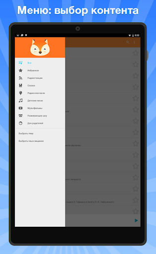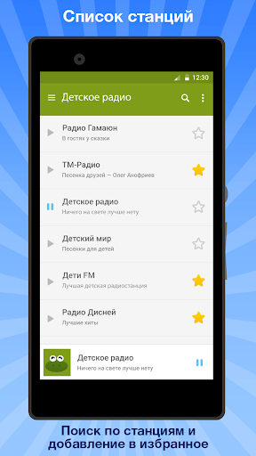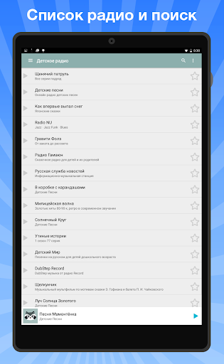 Ứng dụng này có chức năng thêm các trạm để yêu thích, cũng như danh sách tất cả các đài phát thanh. Để sử dụng danh sách này rất thuận tiện, ngay cả con bạn cũng có thể đối phó với điều này. Trong tương lai, chức năng ghi ether xuất hiện. Ngoài ra, Phụ lục có khả năng chọn 6 ngôn ngữ phát sóng. Ví dụ: nếu con bạn nghiên cứu tiếng Anh - trong ứng dụng, một lựa chọn lớn các đài phát thanh tiếng Anh, truyện cổ tích và bài hát.
