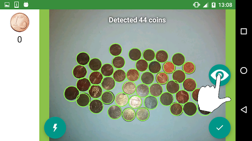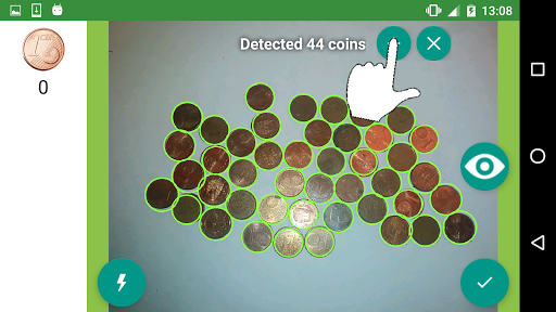 Sometimes you will need to turn on the camera flash for a better detection, and varying the distance from the camera to the coins may also improve the detection. With a couple of tests you will get the proper way to handle the application.