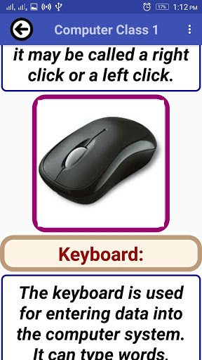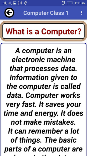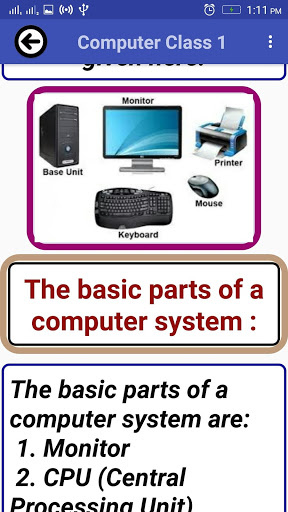 Ứng dụng loại máy tính 1 (một) rất cần thiết cho các sinh viên máy tính của lớp học lớp học và lớp 1. Nó được thiết kế để tìm hiểu các bộ phận của máy tính, cơ bản của máy tính và cơ bản về máy tính với âm thanh và hoạt hình.