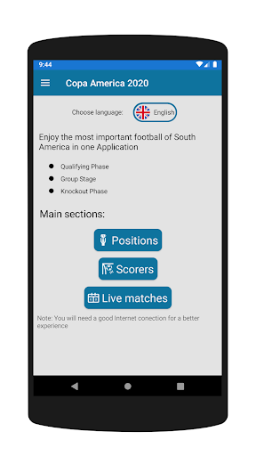 Ứng dụng này cho phép bạn theo dõi trực tiếp tất cả các trận đấu bóng đá của Copa America 2020 đã chơi ở Argentina và Colombia.Bạn có thể làm theo tất cả các thông tin liên quan của các trận đấu trực tuyến: Bảng xếp hạng, người ghi bàn và nhiều hơn nữa.