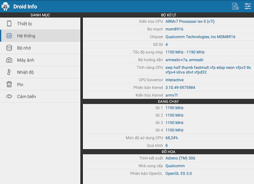 – Hệ thống: Kiến trúc CPU, Bo mạch, Số lượng lõi, Tốc độ xung nhịp, Tính năng CPU, Thông tin về Governor và Kernel. Cũng như Mức độ sử dụng CPU, Tổng số quá trình đang chạy và tần số xung nhịp của mỗi lõi.