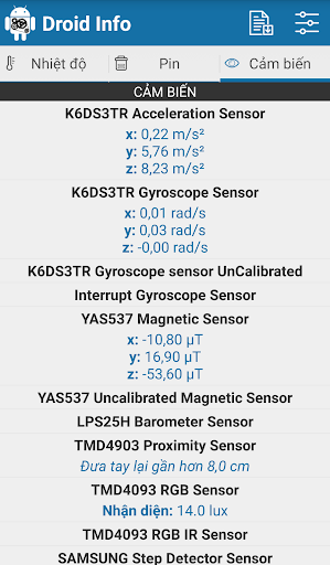 – Cảm biến: Kiểm tra tất cả các cảm biến trên thiết bị của bạn trên thời gian thực.