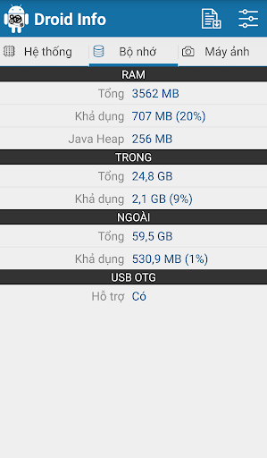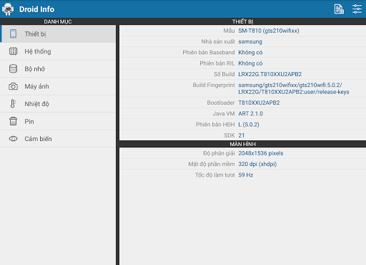 Droid Info là một ứng dụng kiểm tra thông số phần cứng trên Android với những thông tin chi tiết về chiếc điện thoại của bạn bao gồm thiết bị, hệ thống, bộ nhớ, máy ảnh, nhiệt độ, pin và cảm biến. Bạn cũng có thể xuất một báo cáo đầy đủ về chiếc điện thoại thông minh của mình.