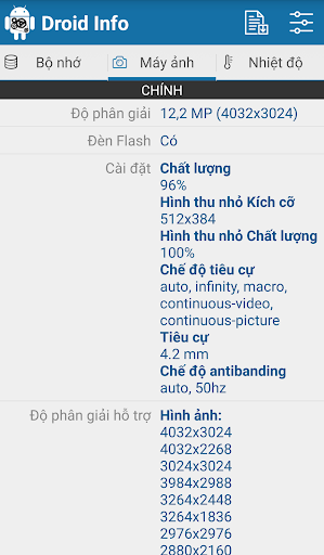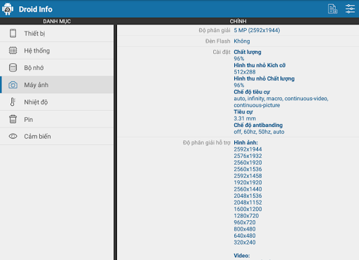 – Máy ảnh: Thông tin chi tiết về máy ảnh chính và phụ trên điện thoại của bạn. Cùng với các độ phân giải hỗ trợ, chế độ tiêu cự và chế độ AntiBanding.