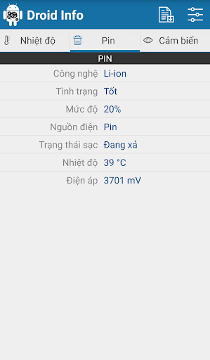 – Pin: Tình trạng, mức độ pin hiện tại, nguồn điện, nhiệt độ, điện áp.