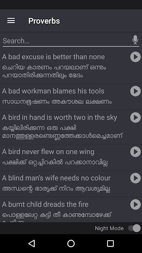 This application contains English proverbs with corresponding Malayalam. It provides simple interface to use and offline. We provide the full version for free. If you have any issue with this app please let us know.