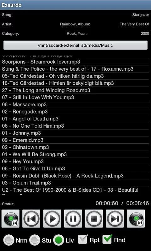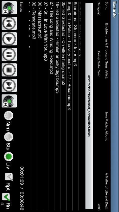 New settings available: "Play Subdirs". Turn On to make Exsurdo list all files in any subdirectories of the current directory. The subdirectories are listed on the top of all mp3-files.