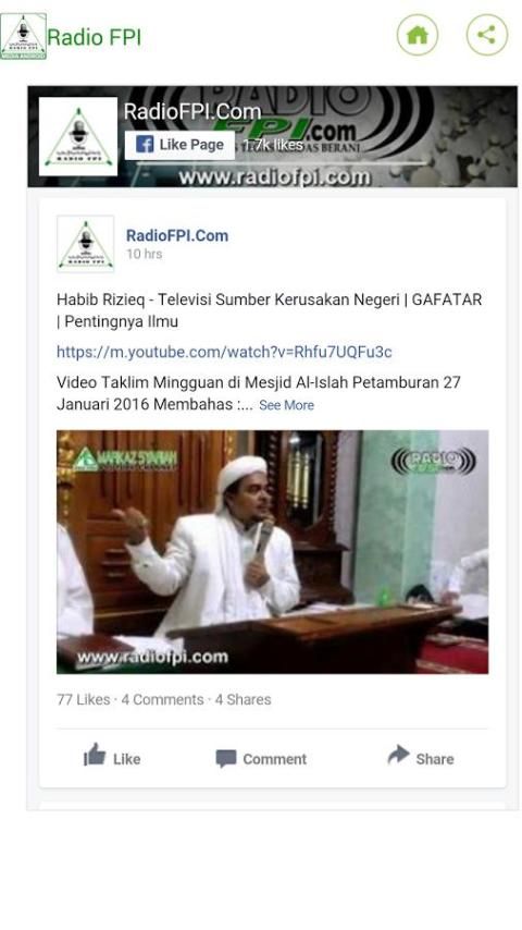 FPI Media applications developed by us to help facilitate the Jamaat Muslim worshipers terkhususnya FPI to get the latest information and the latest scientific study of teachers noble Habib Muhammad Rizieq Shihab bin Hussein through Radio FPI or VIDEO of our study. Hopefully, more and more pilgrims learn easily learn the religion of Islam and practice through this application.