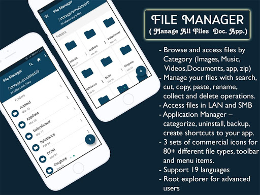 File Manager Pro File Transfer is a complete file manager that allows you to handle any file on your Android device via a clean and intuitive interface. You can also separately handle libraries of pictures, music, videos, documents, as well as rename, delete, move, zip,7zip and send with just a few taps.