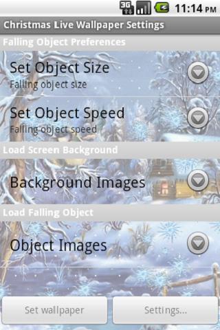 Free Free Free Christmas live Wallpaper LiveWallpaper Not only is this Christmas Wallpaper simple but optimized to save your battery life. Our Christmas Live Wallpaper promises to deliver joy and happiness to those that have it by allowing you to set various backgrounds from a Christmas cat to a winter wonderland. In addition, you can set various falling objects and are not limited to snowflakes. We have many falling objects to choose from:Red OrnamentCandy CaneBlue OrnamentGreen Leaves3 Green LeavesChristmas TreePink OrnamentGift BoxSanta ClausSnowmanSnowflake 1Snowflake 2Snowflake 3 ... over 14 different flakesFeel free to download the FREE version first but we recommend going directly to the paid version. If you are unsatisfied with the purchase please let us know and we will refund the full purchase price. Christmas Live Wallpaper is exactly what you have been looking for...Christmas Live Wallpaper is a christmas themed live wallpaper which has a christmas themed background amp; falling flakes to unlock OPTIONS, ake a look at the FULL VERSION ONLY 0.99