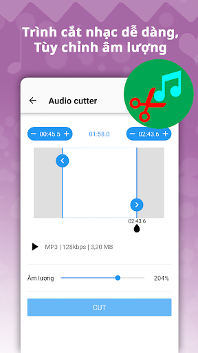 Ứng dụng hỗ trợ ️cắt nhạc đến từng đoạn nhạc nhỏ nhất🎼🎼️ và ️chính xác nhất️ để giúp bạn tạo thành nhạc chuông kinh điển cho mỗi liên hệ của bạn. Đặc biệt ứng dụng còn hỗ trợ bạn điều chỉnh âm lượng giúp cho âm thanh được nổi bật hơn bao giờ hết.