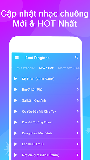 Không chỉ vầy ứng dụng còn luôn luôn cập nhật liên tục các bài nhạc chuông mới nhất, nhạc chuông hot nhất hiện nay với nhiều chủ để & thể loại khác nhau, nó là vô cùng phong phú. Bạn chỉ cần lựa chọn nhạc chuông yêu thích. Các thể loại nhạc chuông bao gồm: Nhạc Theo Tên, Nhạc Nước Ngoài, Nhạc Chuông hài hước, Nhạc Giáng Sinh, Nhạc Vàng, Nhạc Bolero, Nhạc Báo thức, Nhạc Chuông Tin Nhắn, Nhạc Trẻ, Nhạc mới nhất, Nhạc HOT nhất... và còn nhiều hơn thế nữa.