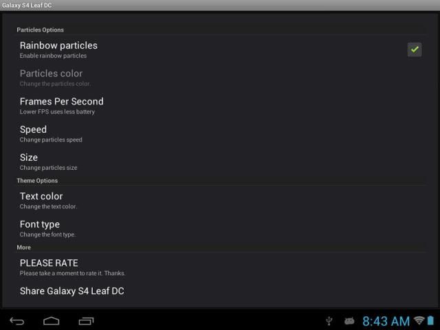Galaxy S4 Leaf with digital clock widget will allow you to give more movement to the screen of your phone like never before. This live wallpaper is highly customizable, and you can set the speed of particles, set the frame rate of your screen for better battery life and even control the clock widget changing the text fonts and colors.