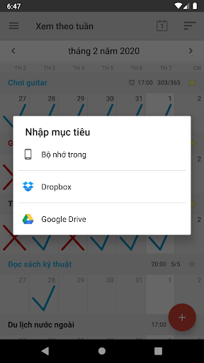 Xuất khẩu sang Dropbox hoặc lưu trữ cục bộ (/storage/sdcard/Goal tracking routine streak). Bạn không bao giờ mất thói quen.