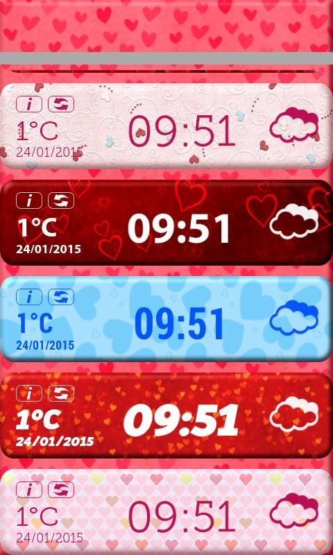 Widget đồng hồ này mang lại cho cái nhìn tuyệt vời cho những giờ phút trong ngày. Chọn một trong các đồng hồ và trang trí điện thoại của bạn. Họ có rất nhiều kích cỡ khác nhau và hình dạng, màu sắc khác nhau và thiết kế. Phụ tùng miễn phí này cung cấp cho bạn đồng hồ vuông, đồng hồ đa giác, đồng hồ hình tròn và nhiều đồng hồ có kích thước và hình dạng khác nhau. Bạn không cần phải xem kênh thời tiết nữa. Widget dễ thương và bạn sẽ biết thời tiết bên ngoài như là những gì. Chỉ cần lựa chọn vị trí và bạn sẽ thấy các địa phương thời tiết trên màn hình của bạn. Tải về ♥ Trái Tim Widget Thời Tiết ♥ cho điện thoại Samsung Galaxy mới của bạn.