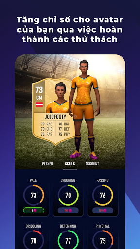 Với Avatar và Player Card 'độc nhất', bạn có thể xây dựng một sự nghiệp kỹ thuật số của riêng mình trong ứng dụng. Bằng cách vượt qua các thử thách, bạn sẽ dần trở nên tiến bộ hơn qua các cấp độ khác nhau trong trò chơi. Tăng chỉ số của riêng mình trên Player Card của mở khóa các thiết bị và vật liệu mới và độc lạ cho Avatar để trở thành huyền thoại bóng đá kế tiếp của Just Football.