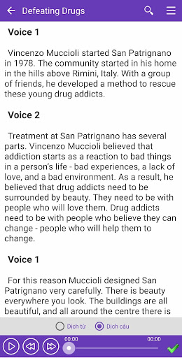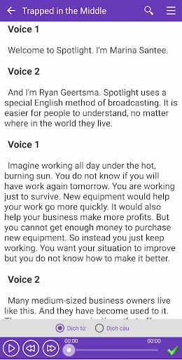 ♦ Có chức năng dịch từ điển bằng cách chạm vào từ hoặc câu bạn muốn dịch. Bạn sẽ rất thích chức năng này vì nhờ nó bạn có thể hiểu được toàn bộ bài hội thoại một cách dễ dàng. Tuy nhiên để sử dụng được chức năng này bạn cần phải cài thêm phần mềm Từ điển Anh Việt TFlat.