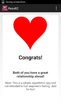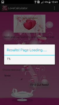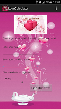 is a love percentage reading tool for Android. The purpose of Love Meter is to find the extent of affection between partners and thereby the love compatibility of any two people. Enter names into the love meter or choose from the given list and find the love percentage.This love meter can be used any number of times. So, go ahead calculate your chances on a successful relationship.