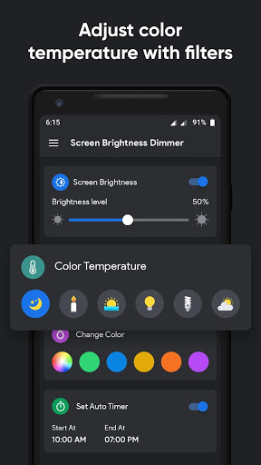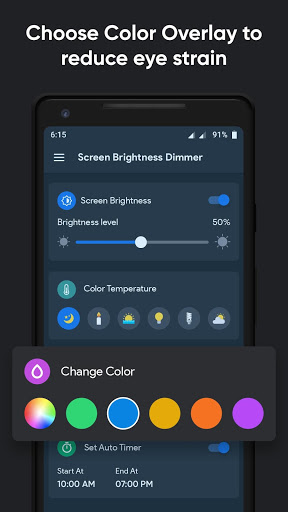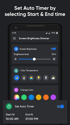 In this Lower Screen Brightness Dimmer - Night Filter App there 4 options are available. You can set the brightness level how much you needed. Select color temperature directly & brightness will auto set with related to that object light. You can choose a color for overlay by selecting or by picking 1 of them. At last, you can set the auto-timer by selecting the start & end time of the day.